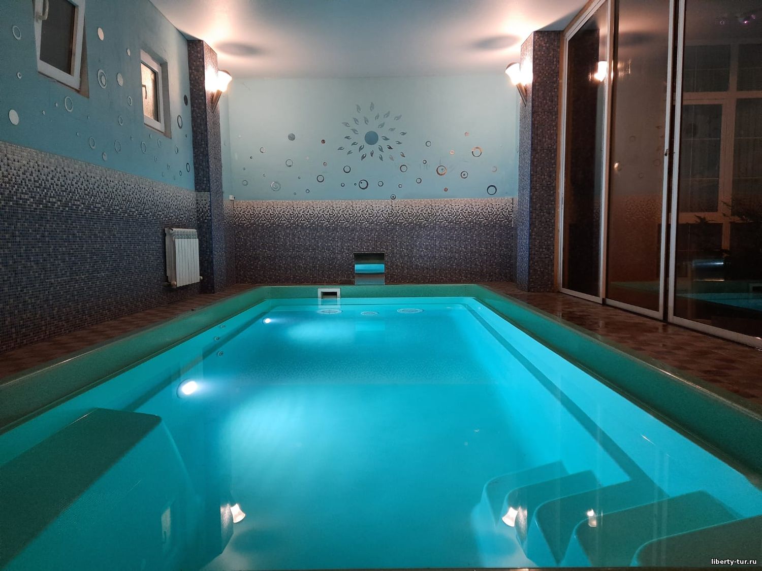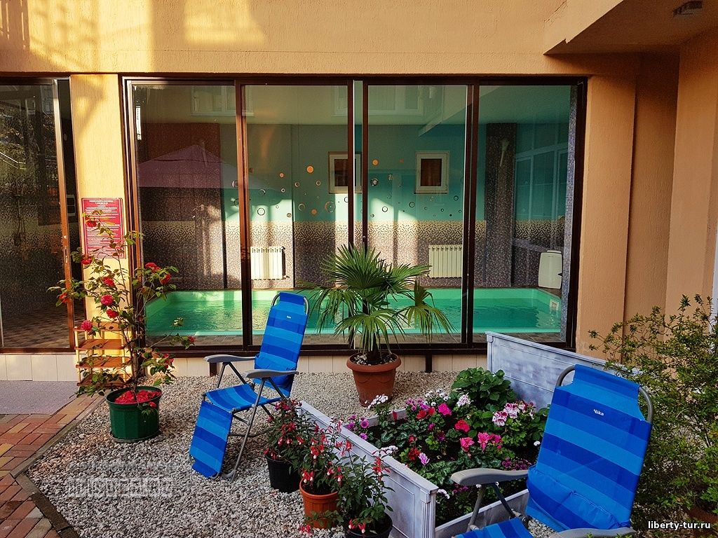 К услугам отдыхающих: К услугам отдыхающих: уютный двор с местами для отдыха, бесплатный Wi-Fi на территории, детская площадка, крытый подогреваемый бассейн (6х3 метров), гладильная доска и утюг.