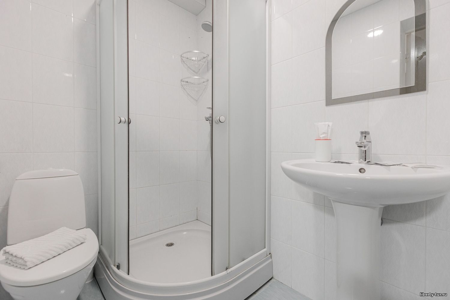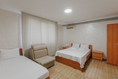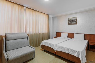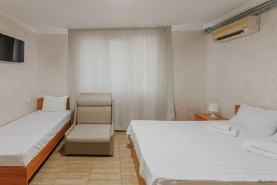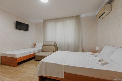 3-местный комфорт: ТВ, холодильник, кондиционер, 2-спальная кровать или две 1-спальные кровати, третье место – кресло-кровать, площадь ~ 19 кв.м., расположены на 1-3-4 этажах.