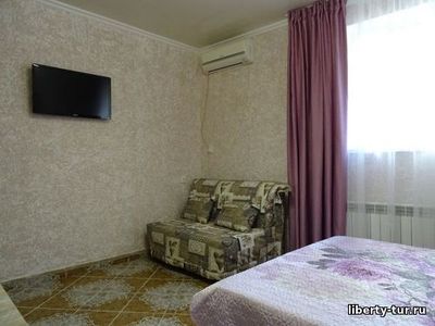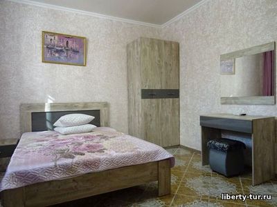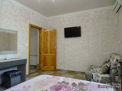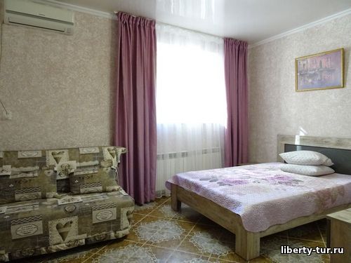 2-комнатный стандарт (5 мест): односпальные или двуспальная кровати, диван-кровать, шкаф, стулья, прикроватные тумбочки, туалетный столик, прихожая, зеркало, холодильник, кондиционер, площадь номера-23кв.м, расположен на 1 этаже.