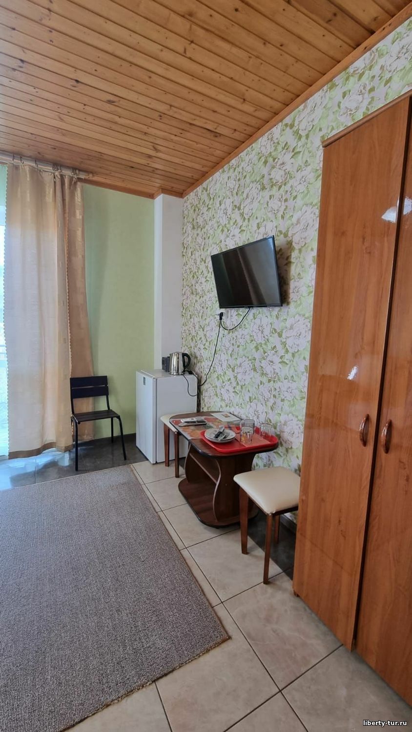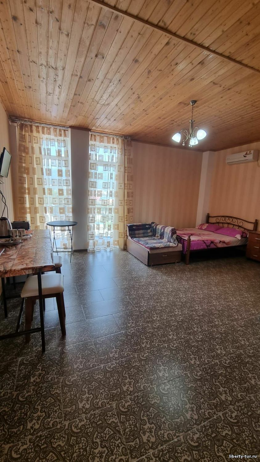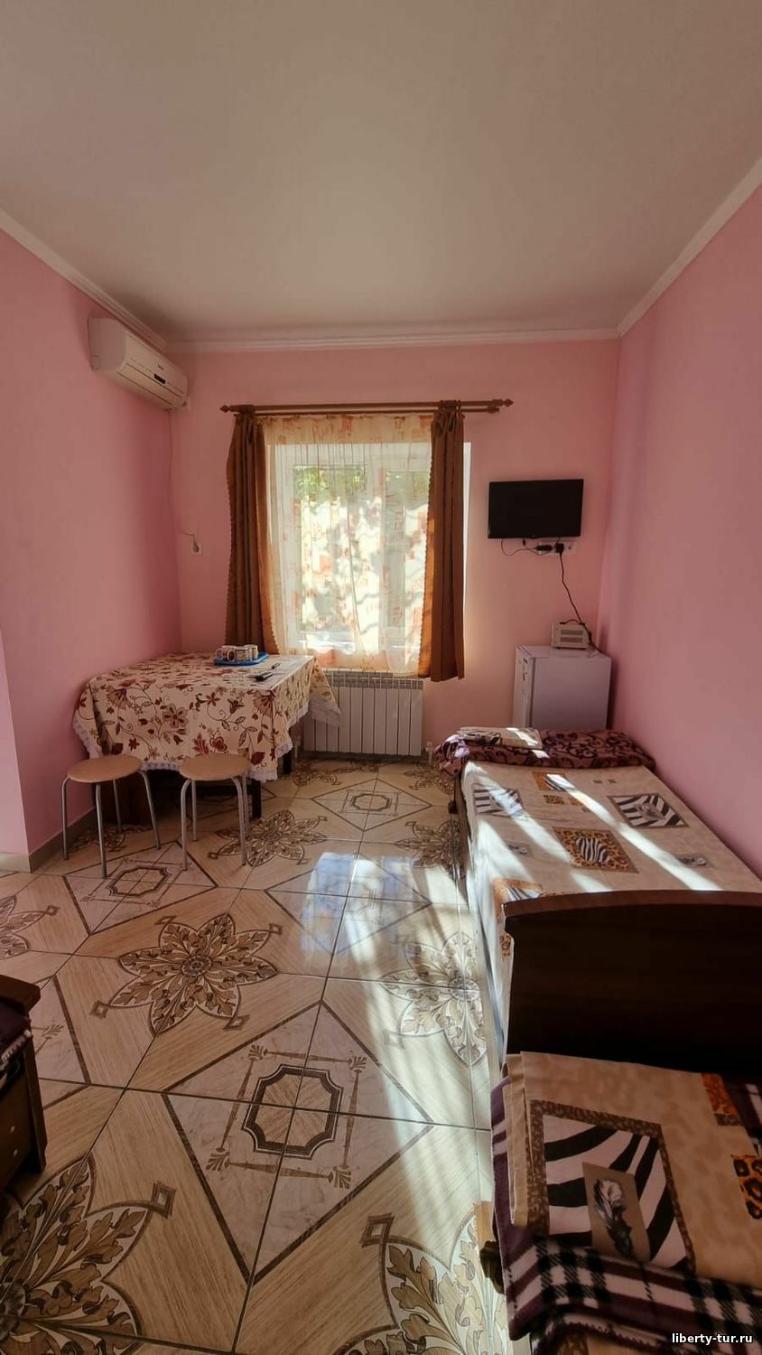 2-3-4-мест. стандарт: односпальные или двуспальная кровати, диван-кровать, кресло-кровать, шкаф, стулья, пуфики, прикроватные тумбочки, журнальный столик, вешалка, зеркало, сплит-система, телевизор, цифровое ТВ, холодильник, эл. чайник, посуда, душ+туалет. Ориент.площадь номеров – 20кв.м. Часть номеров с балконом, часть без балкона – уточняйте при бронировании.