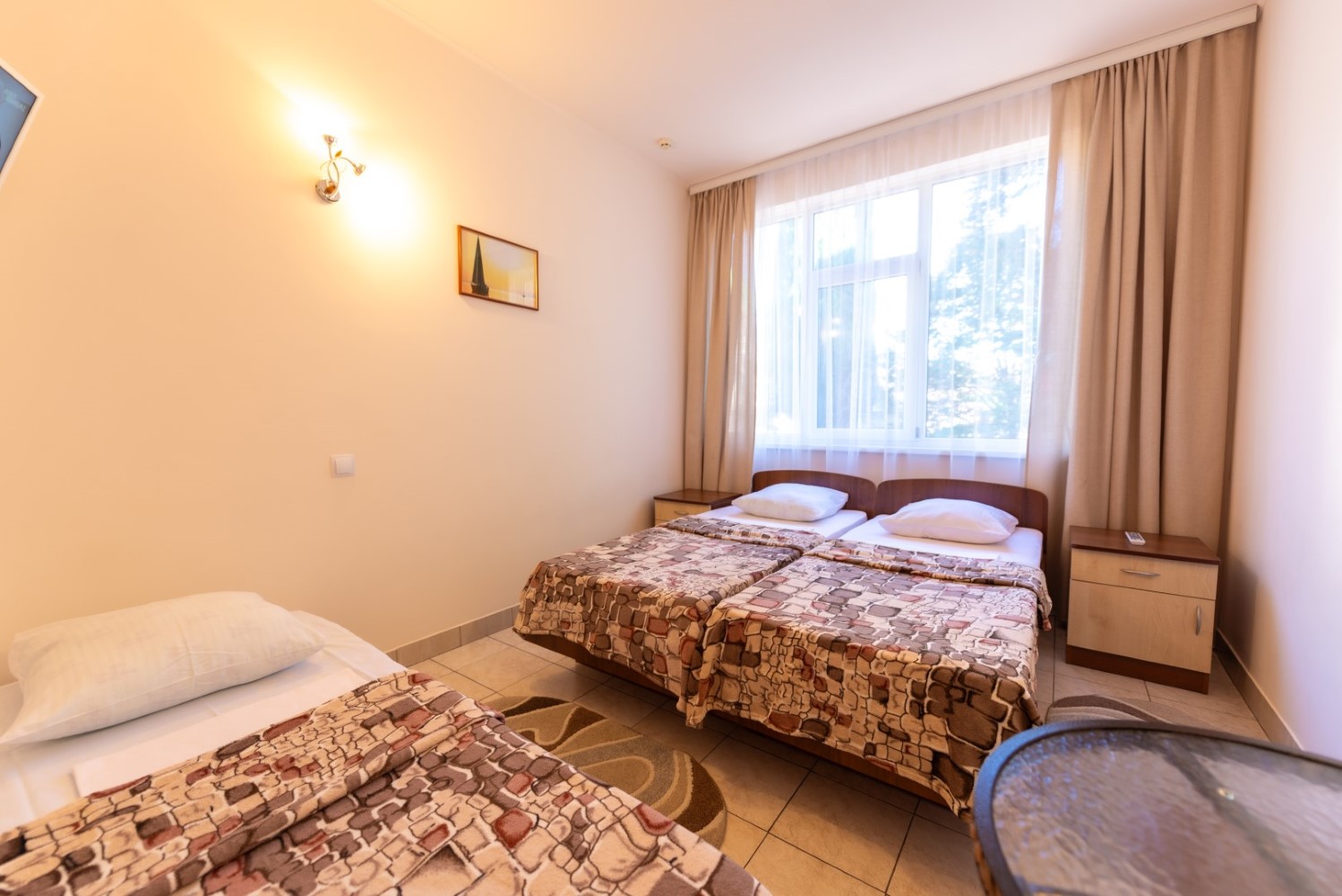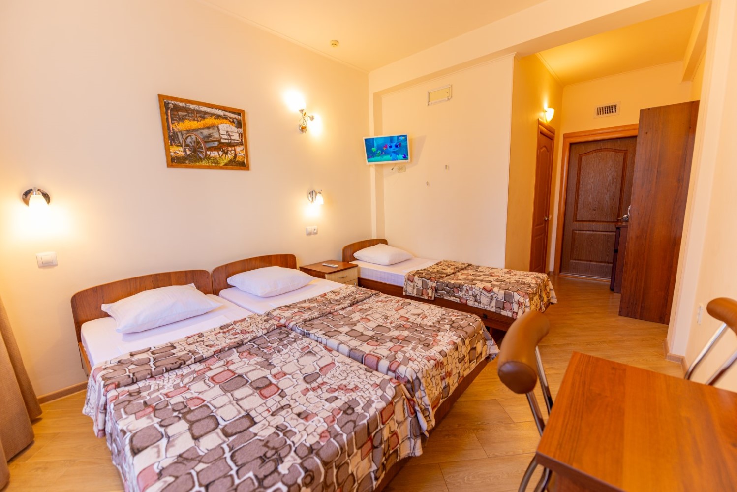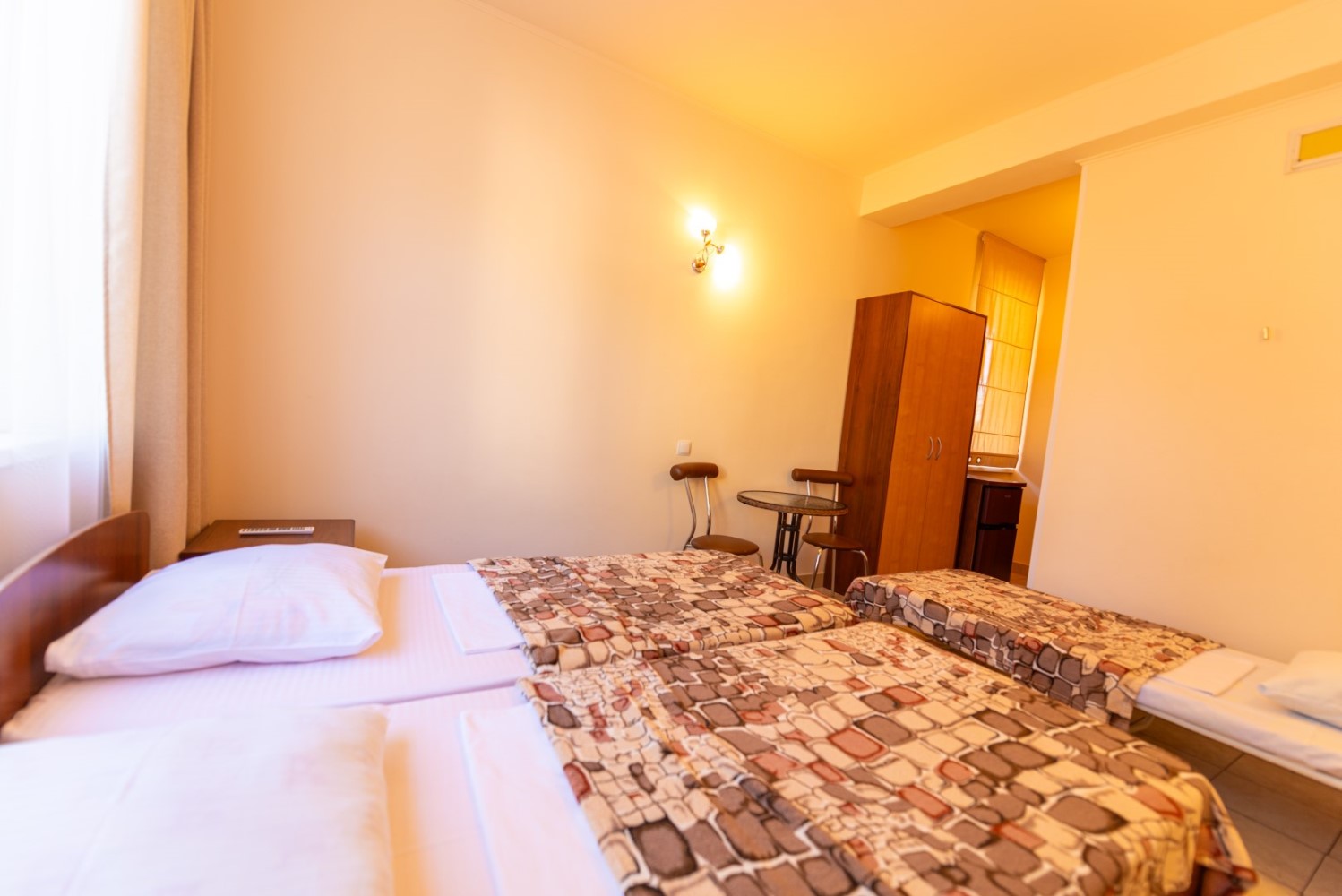 3-мест. стандарт без балкона: ТВ, холодильник, кондиционер, фен, три 1-спальные кровати, номера на 2-3 этаже, площадь номера 18 кв.м.