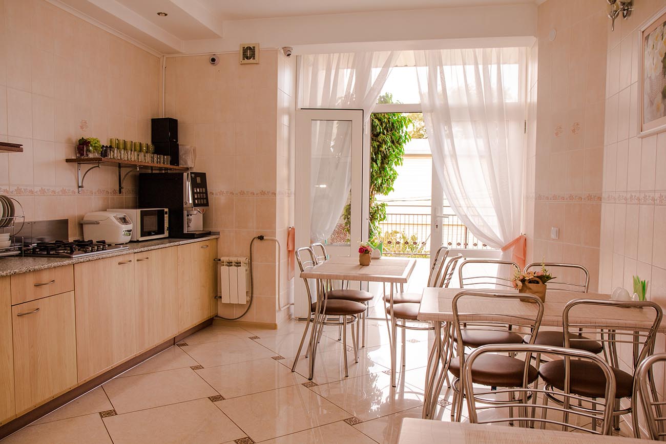 Кухня, оборудованная всем необходимым для приготовления еды (кроме жарения продуктов): газовой плитой, посудой, мультиваркой, микроволновой печью, тостером и термопотом.