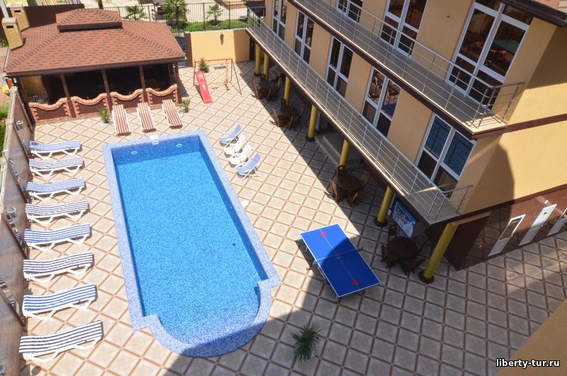 К услугам отдыхающих: закрытый благоустроенный двор, бесплатный Wi-Fi на территории, подогреваемый бассейн (4х11 метра, глубиной 1,8 метра, в детской зоне 1,2 метра), шезлонги и зонты у бассейна, детская площадка, утюг и гладильная доска.