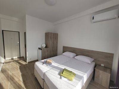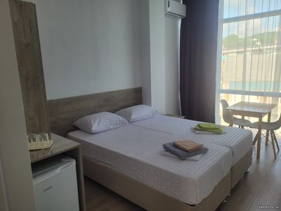- 2-местные номера с удобствами. В номерах туалет, душ, телевизор, холодильник, кондиционер, фен, балкон или панорамное окно. Из-за плотности застройки вид может быть на соседние здания.