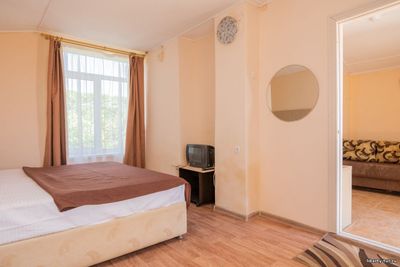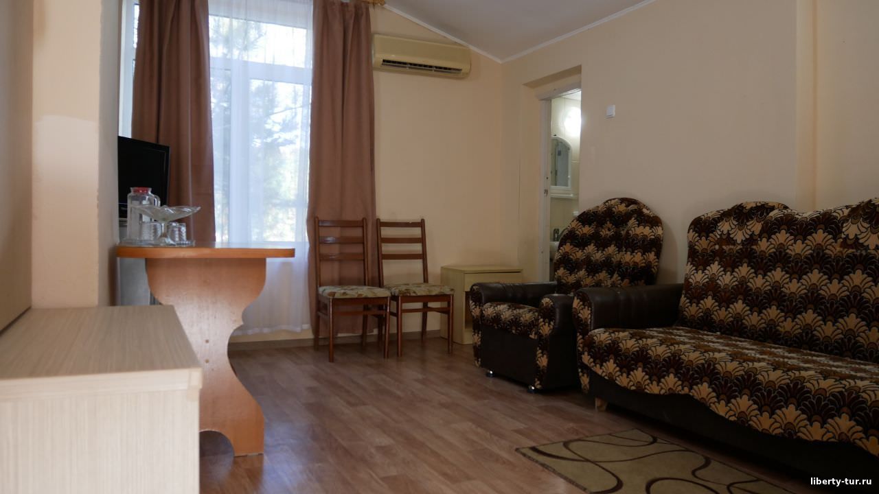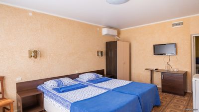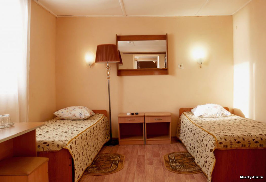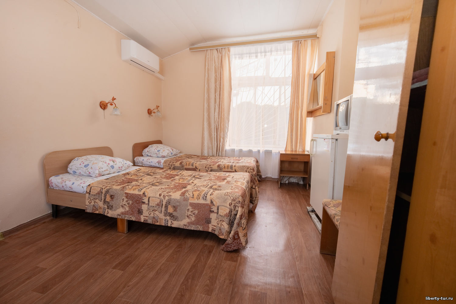 4-местный 2-комнатный номер (макс. 4+1 чел., 28-34 кв. м, телевизор, кондиционер, душ, холодильник, туалет, в номере две спальни - в каждой комнате две 1-спальные кровати). Доп. место - еврораскладушка, предоставляется без ограничения по возрасту.