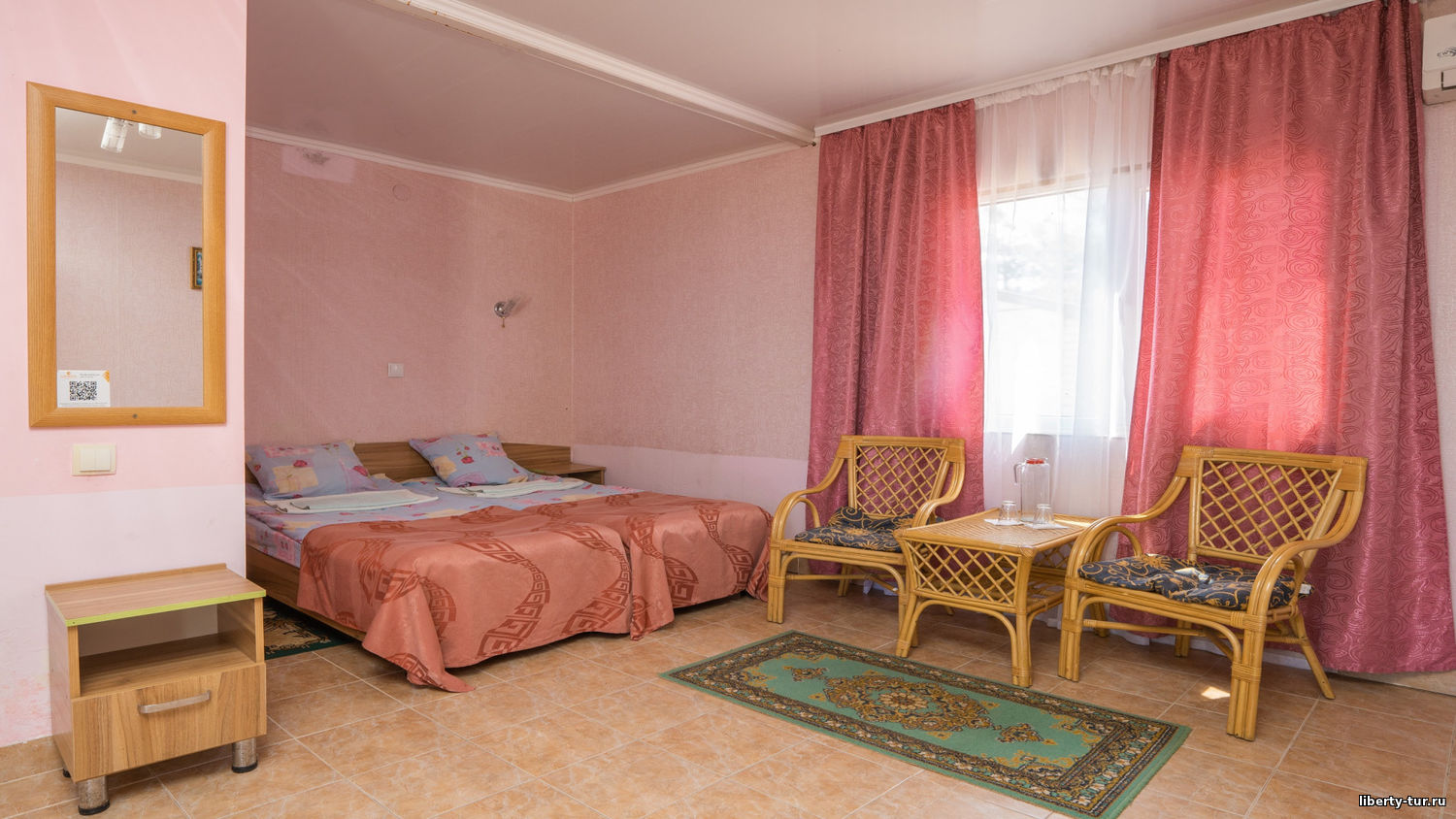 1-местный стандарт (макс. 1+1 чел., 11-15 кв. м, телевизор, кондиционер, душ, холодильник, 1-спальная кровать, туалет, вторая линия, вид на соседние домики). Доп. место - еврораскладушка/кресло-кровать, предоставляются без ограничения по возрасту.