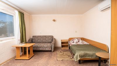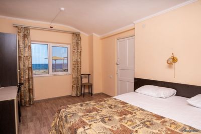 3-местный 2-комнатный номер (вид на море) (макс. 3+1 чел., 28-34 кв. м, телевизор, кондиционер, душ, холодильник, 1-спальные/ 2-спальная кровать, туалет, первая линия домиков). Доп. место - раскладной диван, предоставляются без ограничений по возрасту.