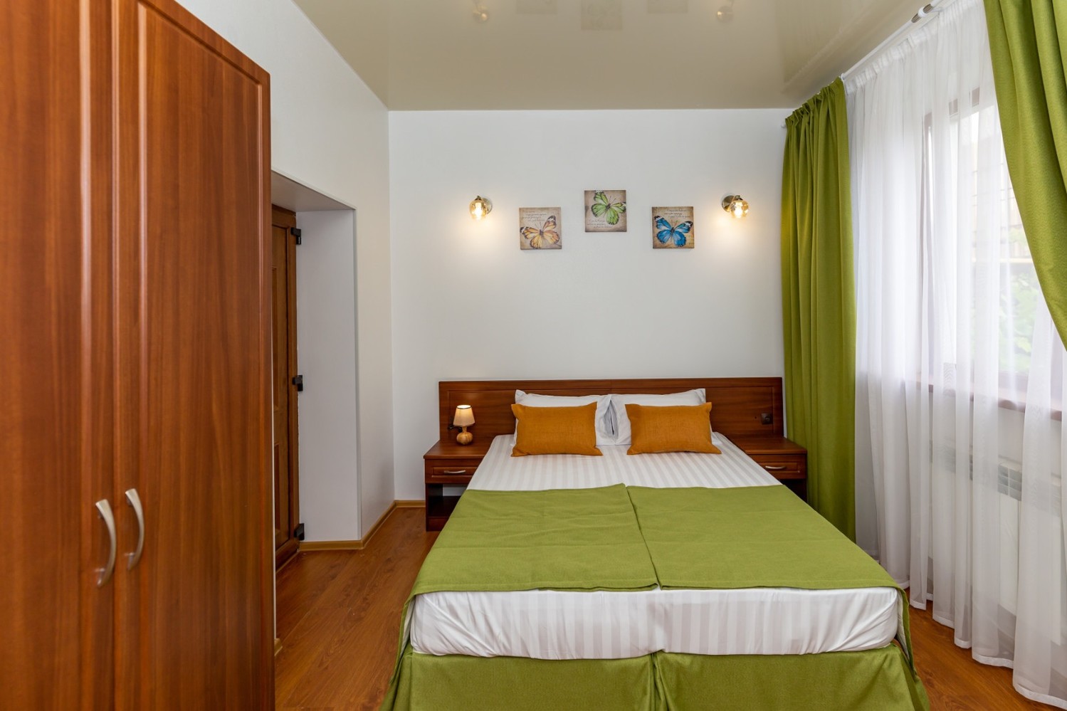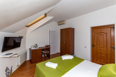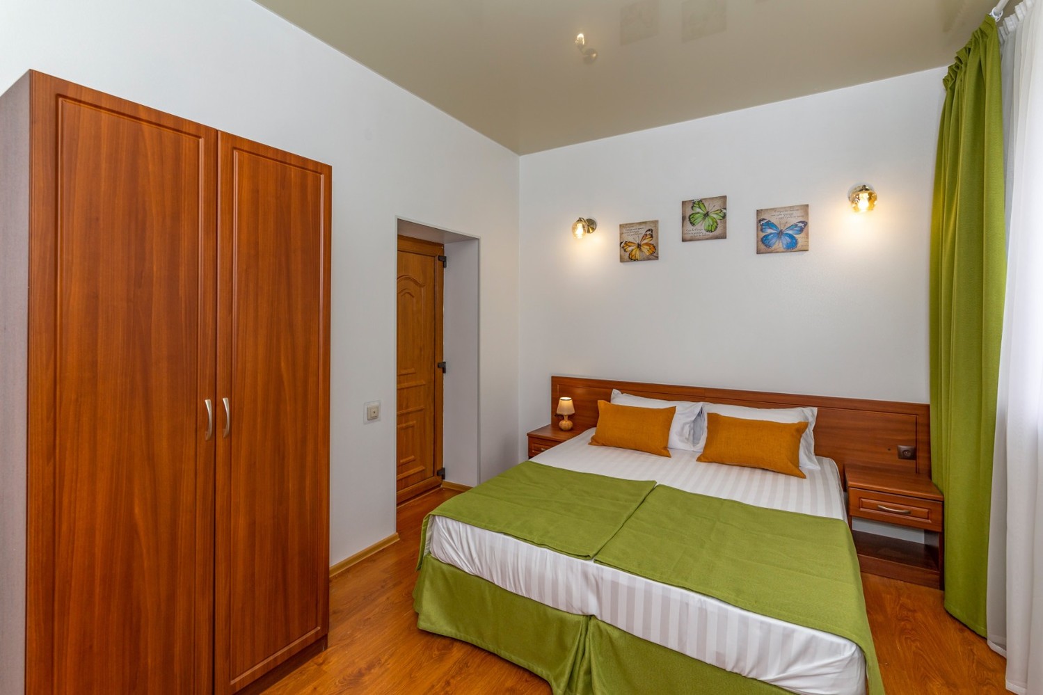Очень уютный номер, который идеально подойдёт для молодой семейной пары. Внутри есть всё необходимое: быстрый и бесплатный Wi-Fi, кондиционер, мини холодильник, сейф, телевизор с плоским экраном, зеркало, вешалки и комод для одежды, кружки, стаканы, чайник.