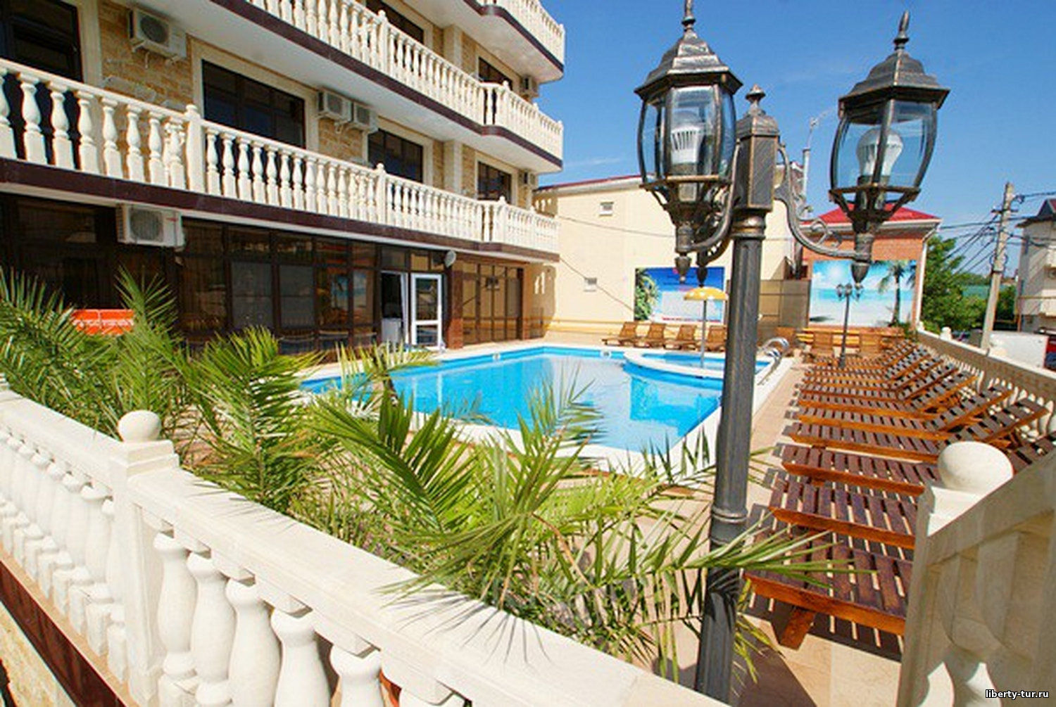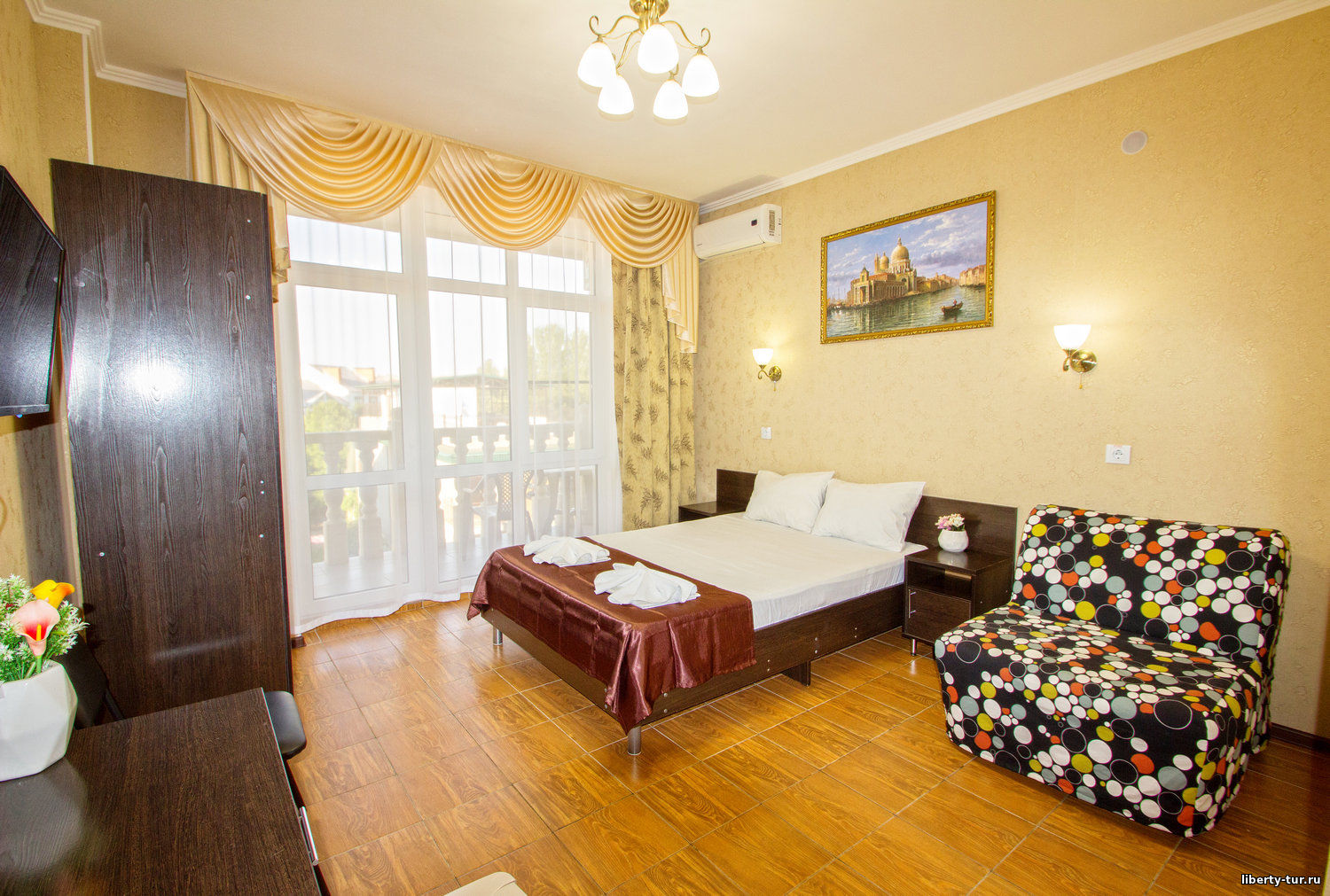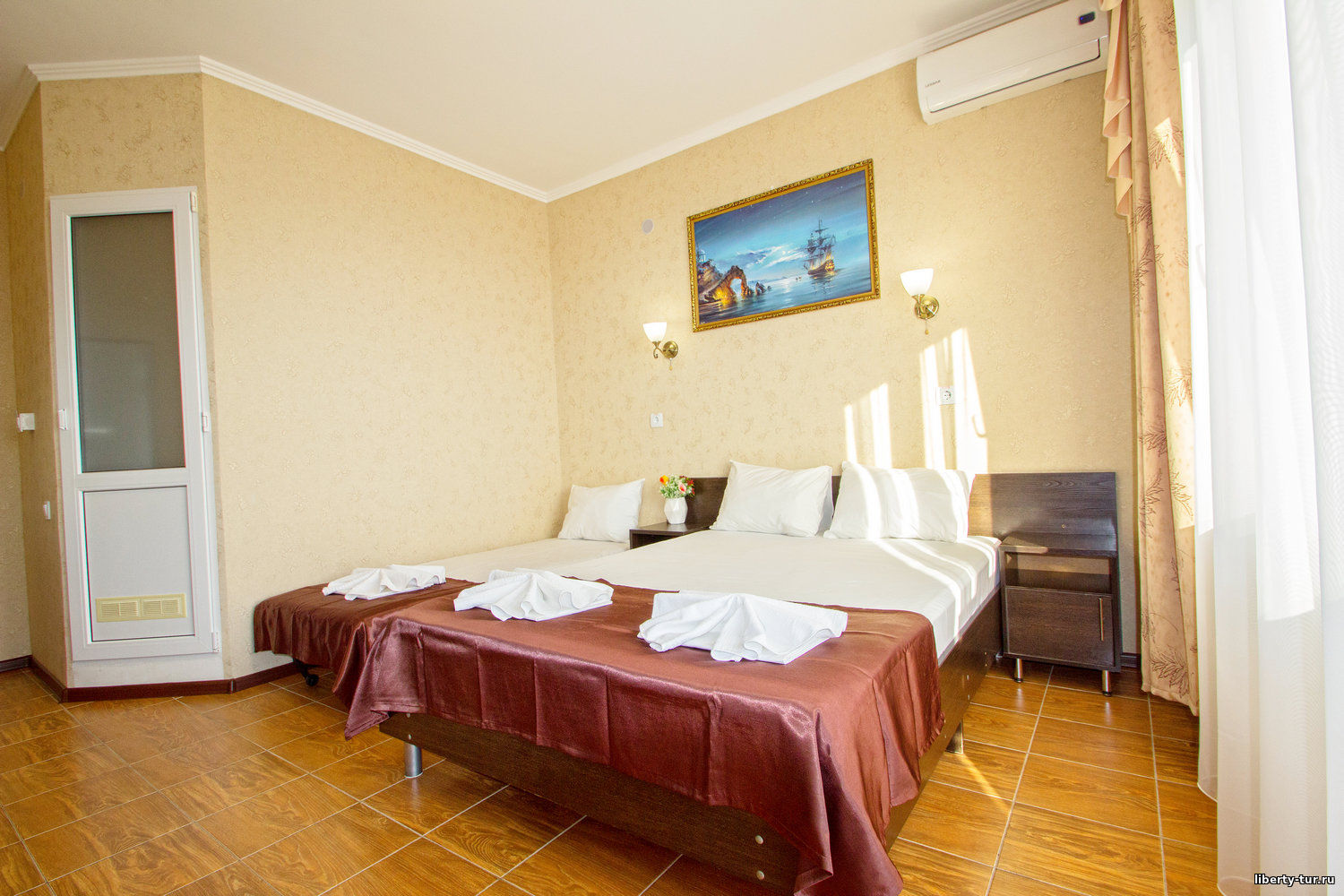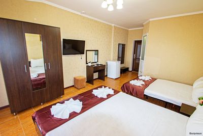 - 2-местные номера с удобствами. В номерах туалет, душ, телевизор, холодильник, кондиционер, фен, сейф, балкон.
